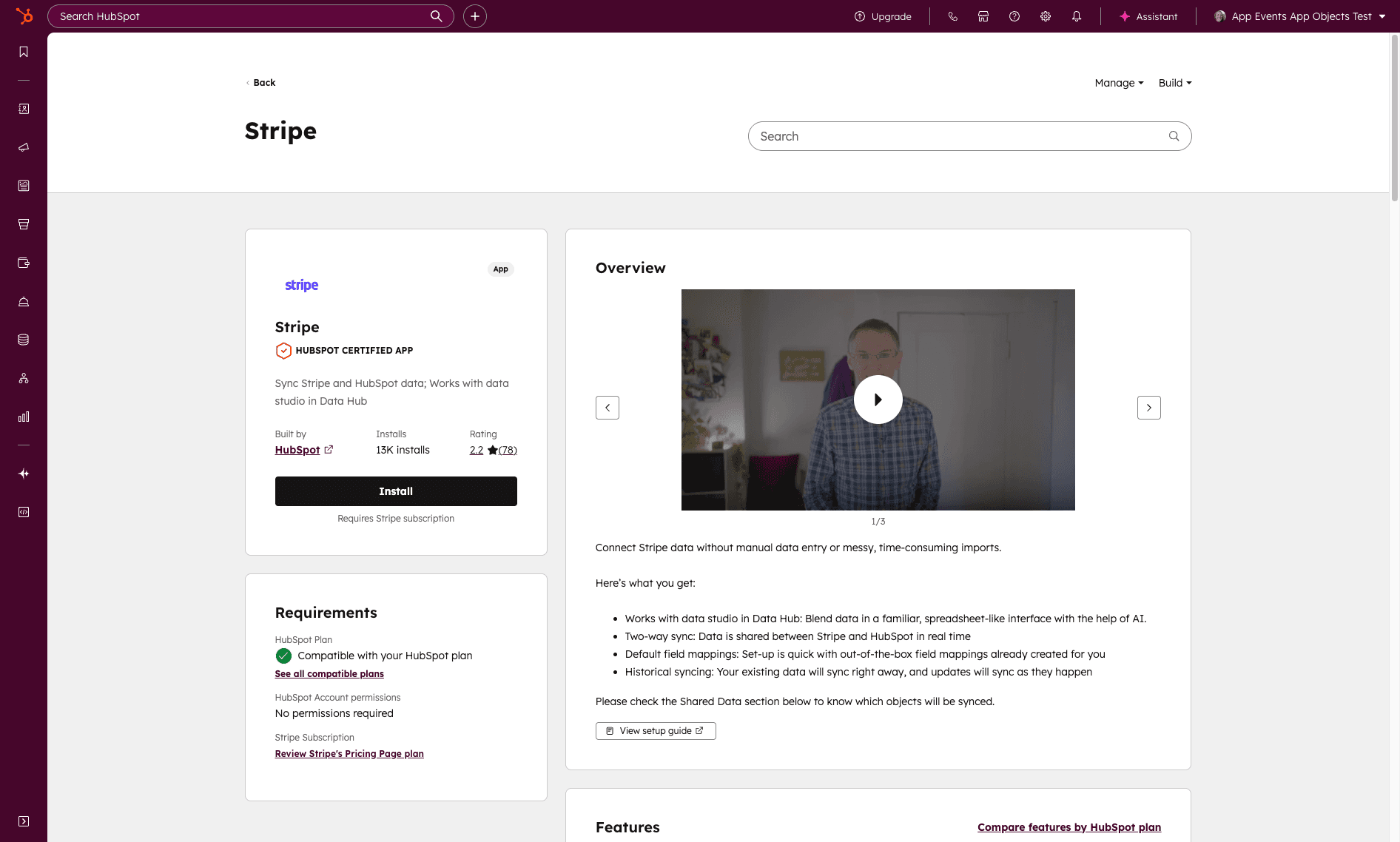 Contact, invoice, and payments import: Import basic Stripe customer, payment, and invoice data to native HubSpot customer, payment, and invoice objects.