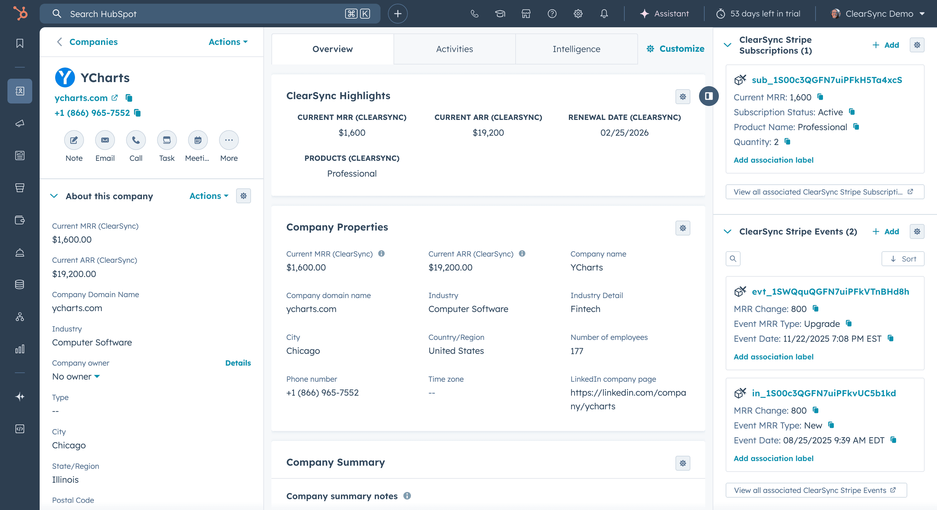 An example of Stripe event and subscription records (right sidebar) associated to the Ycharts company record in HubSpot.