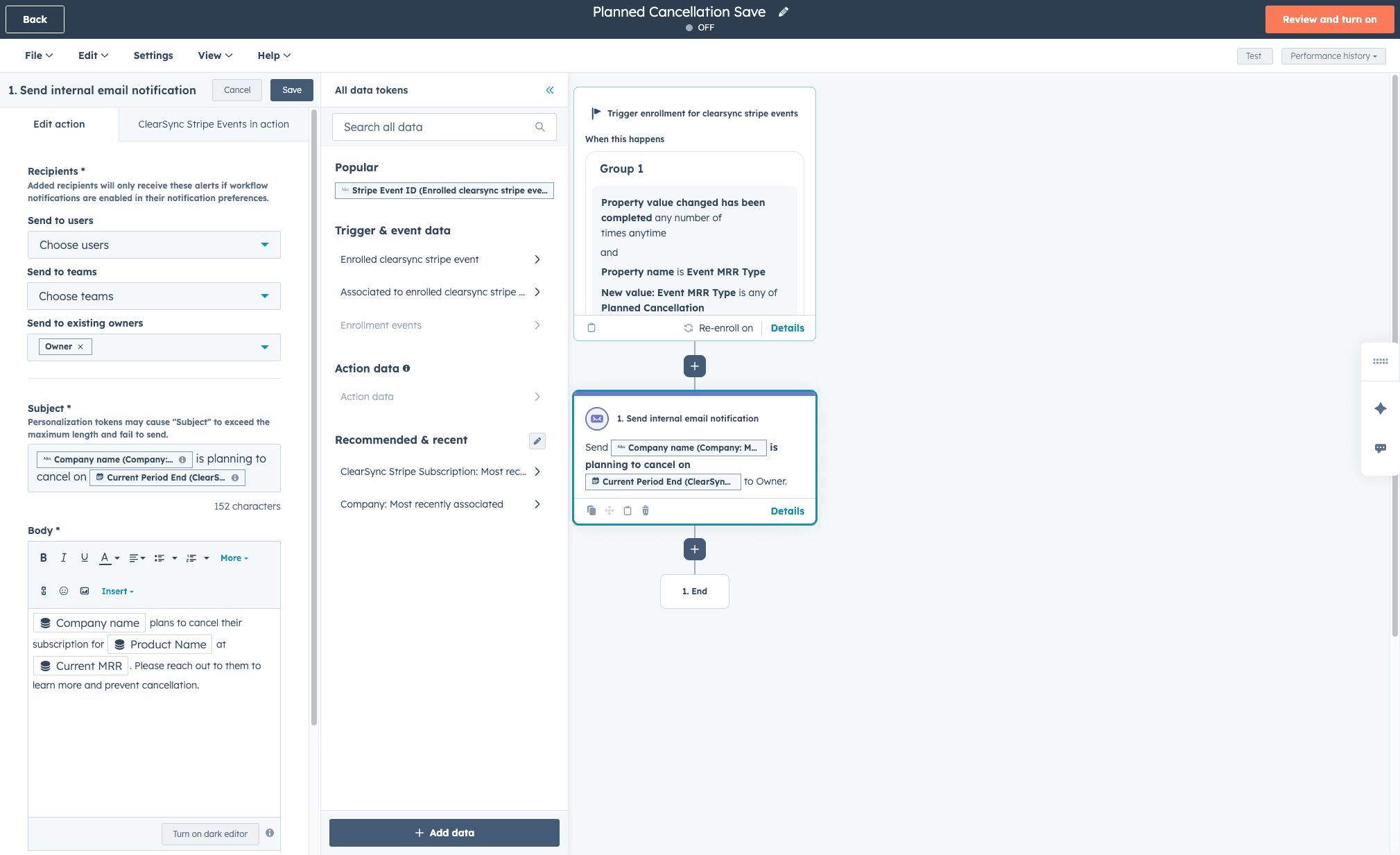 Add an owner notification. As the first action in the workflow, choose Communications > Send internal email notification and set it to notify the existing owner. Use personalization tokens to include relevant context in the notification. You may have to add additional data sources (like the most recent associated Contact record or ClearSync Stripe Subscription record) to use all the personalization tokens that make sense for your internal notifications.