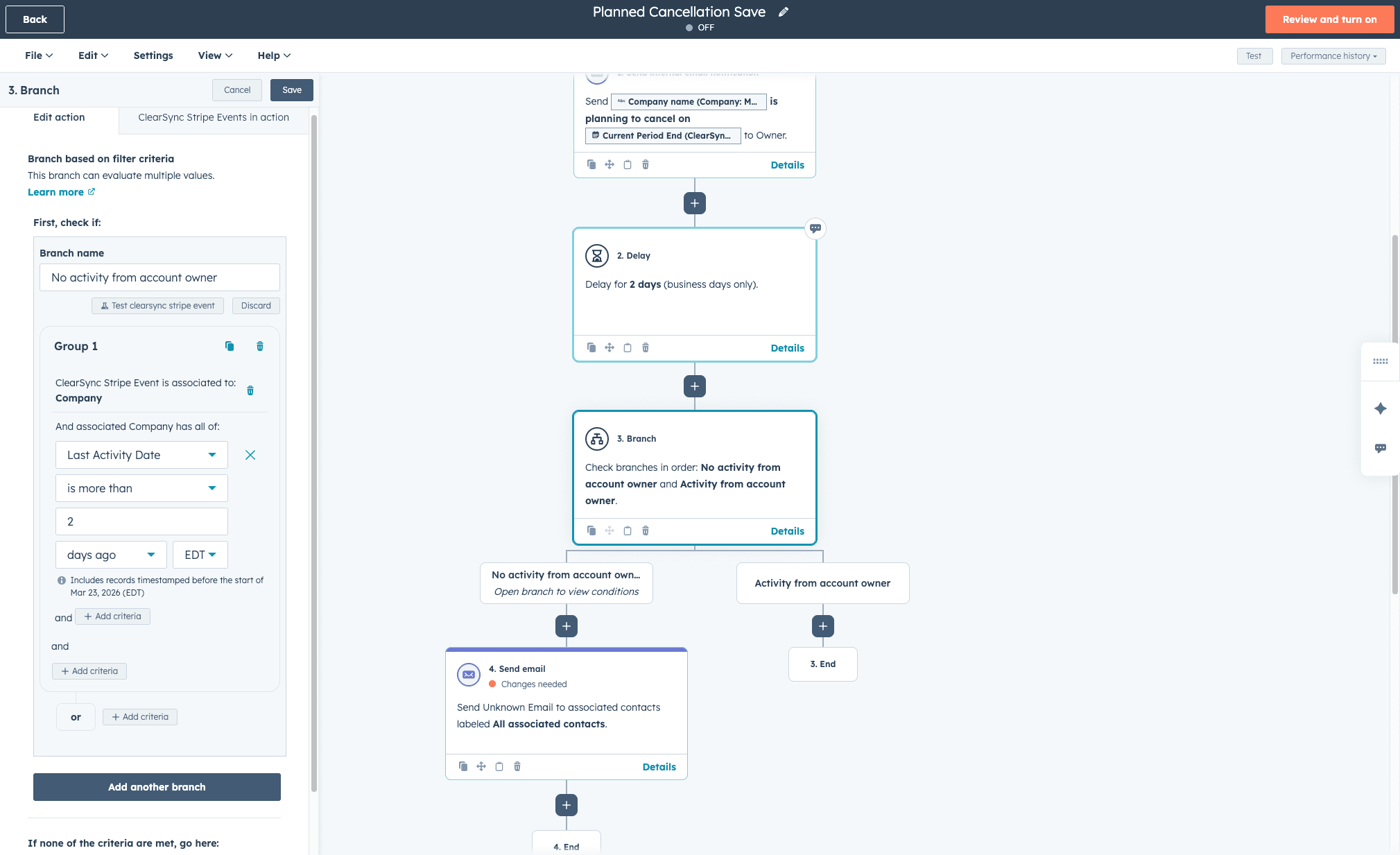 Add a time delay, then branch on owner activity. Add a 2-day delay, then use an AND/OR branch to check whether the owner has logged any activity against the company in the past 2 days (a call, email, meeting, or note). If activity exists, end the workflow because manual outreach is already underway. If no activity is logged, proceed to the save sequence in the next step. This prevents the automated sequence from firing alongside a live conversation, which creates a poor customer experience.