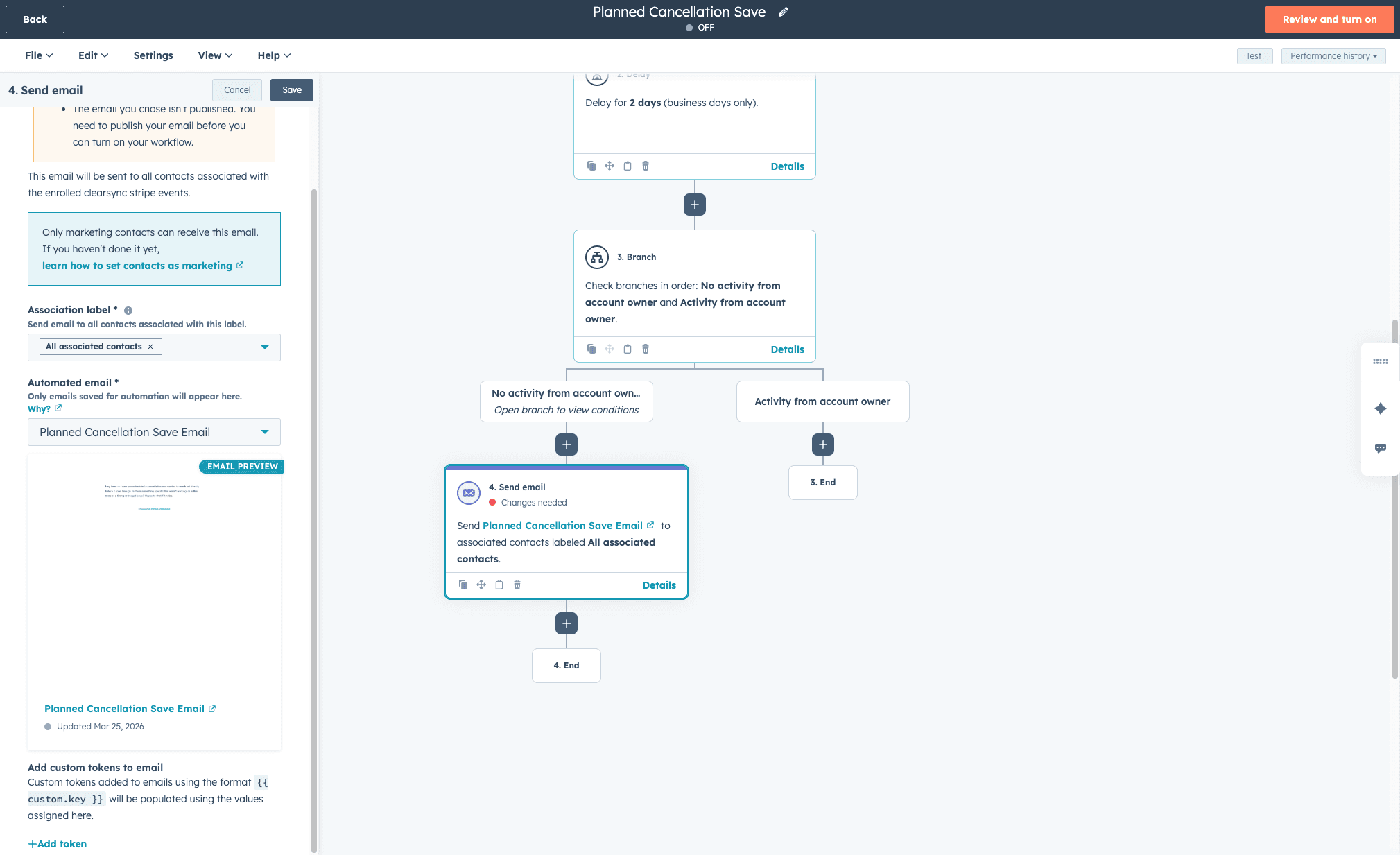 High-value accounts may warrant a different approach. Consider adding an AND/OR branch early in the workflow based on Current MRR value. Above a certain threshold, you may want to skip the automated sequence entirely and route directly to a senior team member for a personal outreach call rather than email.