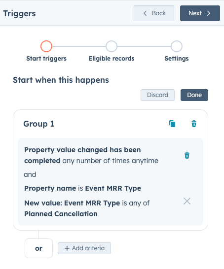 Create a new workflow. In HubSpot, go to Workflows > Create Workflow > From Scratch. Set the enrollment trigger to Data Values > Property Value Changed > ClearSync Stripe Event > Event MRR Type is any of Planned Cancellation.