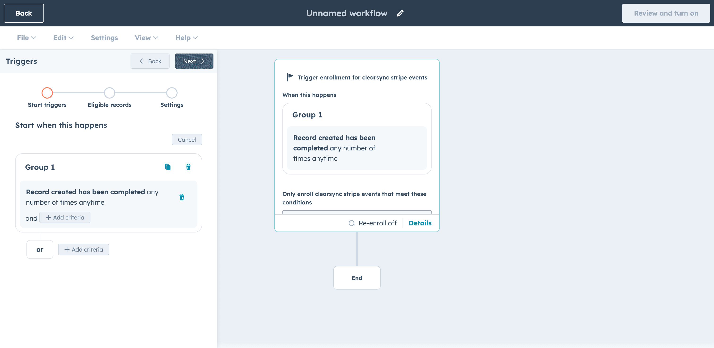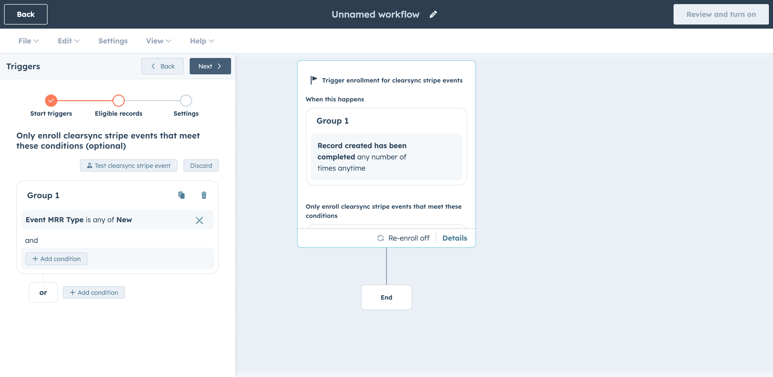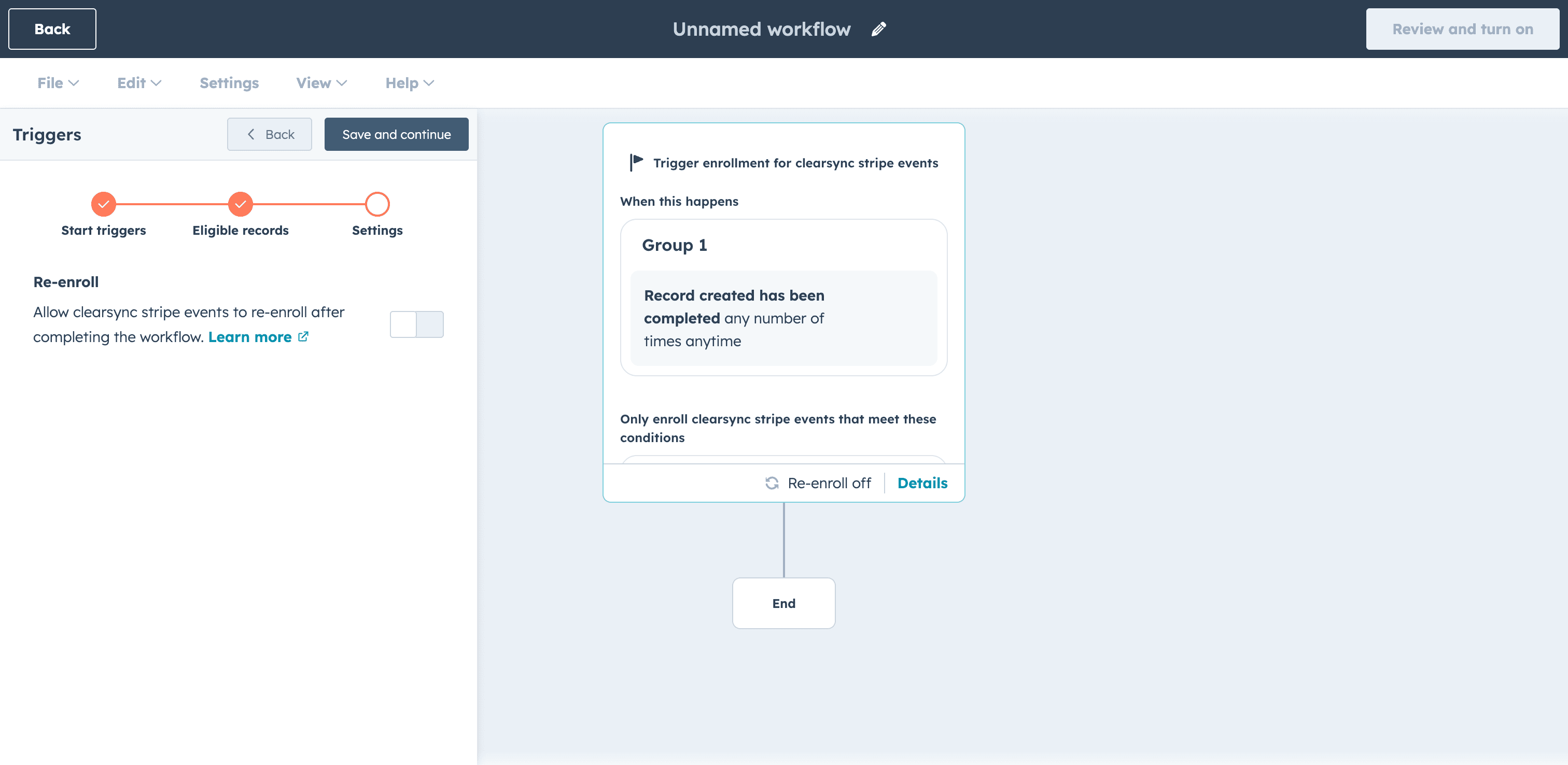 Set re-enrollment to Off because ClearSync Stripe Events are created once and don't update, so re-enrollment isn't needed. Save and continue.