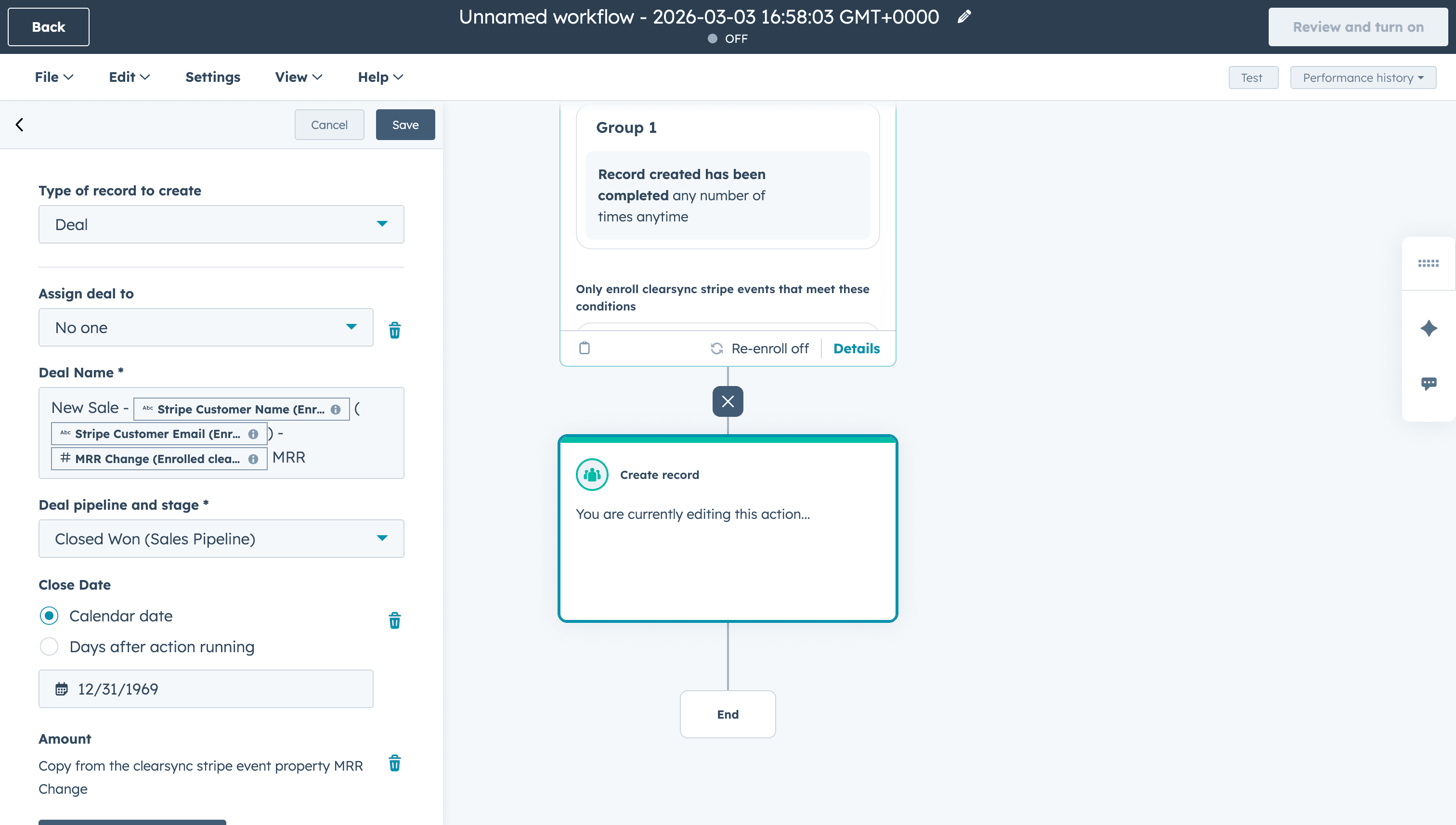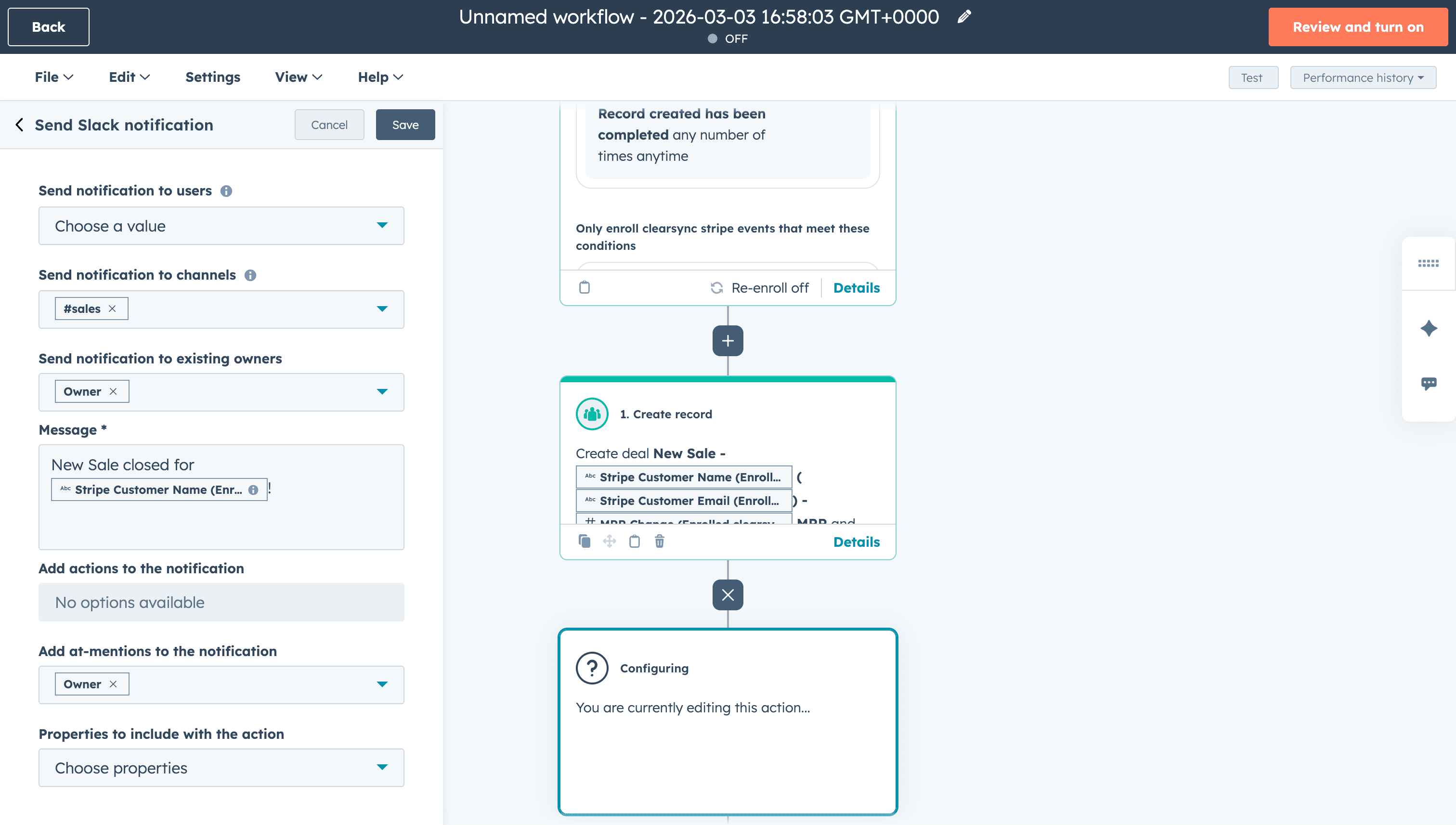Name your workflow and turn it on. You're now all set to create Closed Won deals and send notifications in HubSpot when a new sale happens in Stripe!