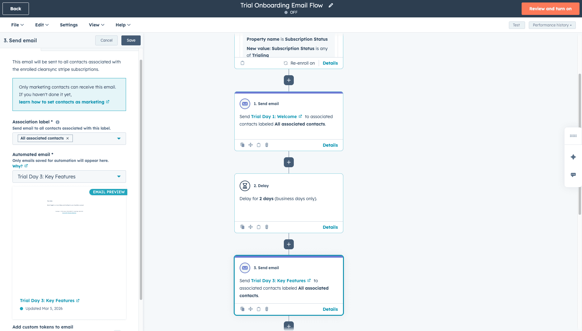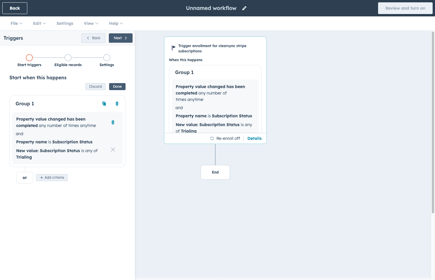 Set unenrollment criteria. Click "Review and turn on". In the workflow's unenrollment settings, add the rule: Subscription Status is any of Active. This automatically removes contacts from the trial sequence the moment their subscription converts to paid so they stop getting trial conversion emails after they've already converted.